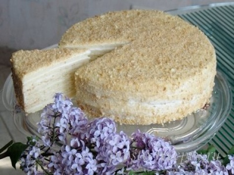 Дать коржам остыть, три из них промазать кремом, а четвертый раскрошить и посыпать сметанный торт сверху.