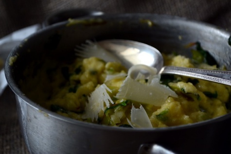 Когда каша хорошо разварится и станет гладкой, добавить сливки и шпинат.